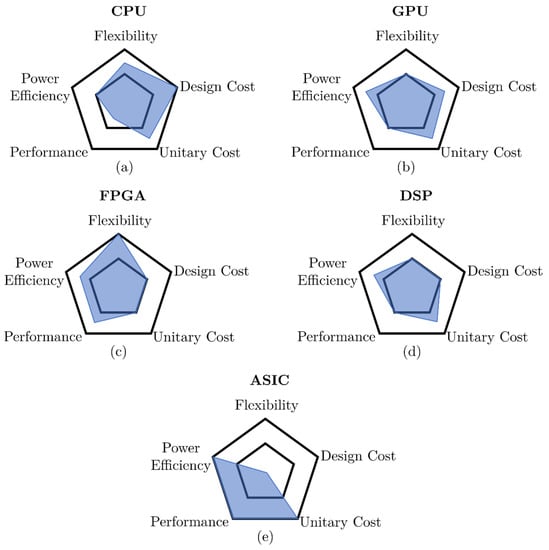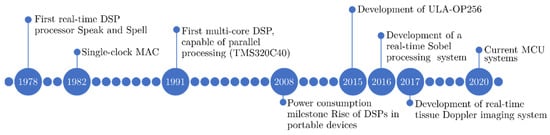 DSPs are designed to measure, filter and/or compress continuous signals. They can obtain data and execute instructions simultaneously with low latency and power consumption. As a result, these devices typically do not require a demanding power system or cooling system, making them suitable for use in portable devices. Furthermore, this characteristic makes them less risky—in terms of their re-programmability and lifespan—and more cost-effective than ASICs for small productions [,]. Their evolution has been motivated by the custom algorithms they execute, as every feature is designed to increase the performance of the heavy computations carried out by the processor.
