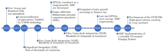 FPGAs are integrated circuits capable of post-fabrication reconfiguration, both interconnect and hardware functionality, using hardware description languages (HDLs). This type of device is based on an array of logic blocks, such as lookup tables (LUTs), flip flops and logic gates, connected through programmable interconnects along with input/output ports. Therefore, FPGAs allow custom hardware design with the flexibility to make modifications due to design errors or improvements. Thus, it is recommended to use FPGAs when the system specifications demand high performance, usually with real-time processing. Indeed, they are used to avoiding becoming involved in the complexities and lower flexibility of ASIC design (as it will be described now).
