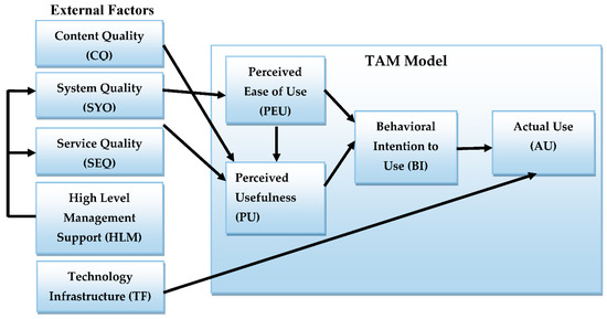 In this study, the proposed model in Figure 1 was developed by extending the TAM model in order to explain and understand the significant factors that influence students’ usage of the mobile learning platform in JORDAN. Based on the above discussion, TAM is the most recent and widely used model, which uses five constructs, including perceived usefulness, ease of use, attitude toward to use, intention to use and actual use as predictors of the technology usage and acceptance [49,50,51,52]. TAM model as shown in Figure 2, hypothesized that the two main determinants for an individual to use any new technology are the user’s perceptions of ease of use as well as their perception on its usefulness [32].
