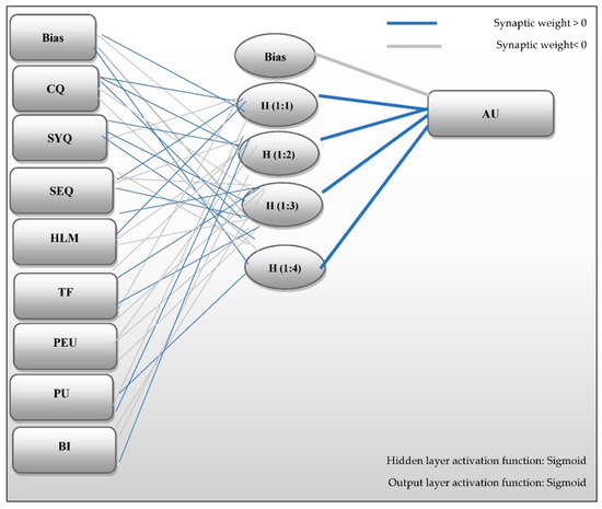 For starting the ANN analysis, we should first determine the independent variables for this study that represents the input layers (input neurons) and dependent variable (output layer) in the ANN model. For this study, the independent variables (CQ, SYQ, SEQ, HLM, TF, PEU, PU and BI) were the input layers (input neurons) of the ANN model. This means the number of input neurons (input layers) equal eight, which is the number of predictors. In construct, the output layer in the ANN model was the dependent variable, which is AU, as shown in Figure 4. This means the number of output neurons (output layers) equals one. The hidden layers (hidden neurons) are automatically generated using activation function (Sigmoid function). The number of hidden neurons is calculated based on the complexity of the problem to be solved by using SPSS software.