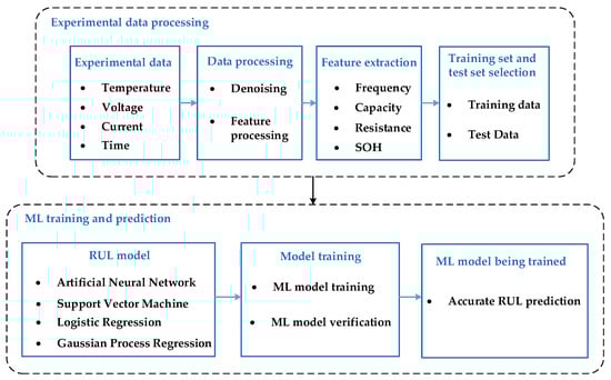 The ML method is the preferred method for predicting RUL when historical life cycle data are available [,]. Figure 1 shows the basic workflow of introducing ML in the process of predicting RUL. First, collect raw data that can be directly measured by the battery, such as operating temperature (T), charge/discharge current (I), and operating voltage (V), as inputs for the ML model. Secondly, perform preprocessing operations such as denoising on the original data and extracting the feature vector representing the aging behavior. The feature extraction step seriously affects the RUL estimation performance. Finally, the trained ML model will simulate the relationship between the characteristic value and the battery RUL and realize the prediction of the RUL.