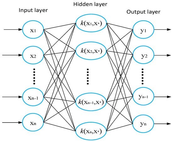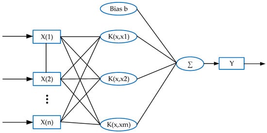 The problem becomes the function in the minimization Equation (2), where n represents the number of samples and λ represents the regularization parameters. Specifically, SVM can also use the kernel function to transform the input low-dimensional vector into a high-dimensional feature space, and then use the hyperplane to separate the data, thereby applying the kernel method (the decision-making boundary element has Equations (3) and (4) as shown above, where φ is the mapping function). The structure of the support vector machine algorithm is shown in Figure 2.