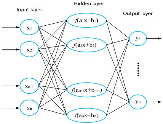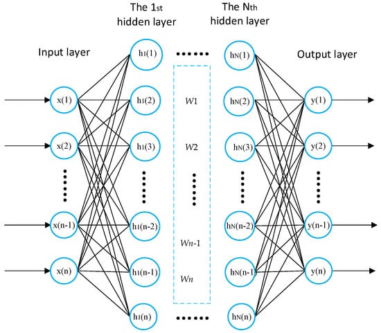 where the weight and bias are W and b, respectively. The weight before the input layer and the hidden layer is represented by , and the bias vector and the nonlinear activation function of the hidden layer are and , respectively.
