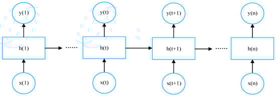 Figure 6 shows the typical structure of an RNN. For an input sample where N denotes the sequence length, RNN calculates the hidden state vector sequence and outputs the sequence through iteration of the Equations (12) and (13), from to N.