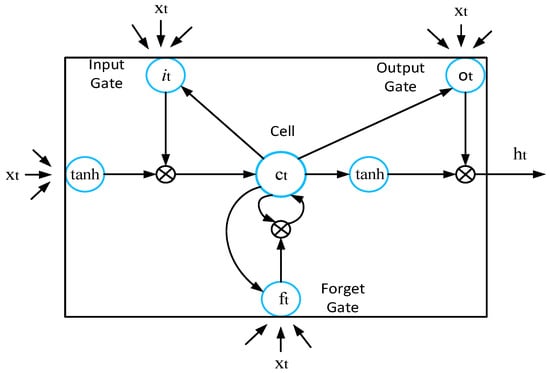 where represents the logistic sigmoid function, denotes the hidden-input gate matrix, and is the input/output gate matrix. The LSTM algorithm structure is shown in Figure 7.