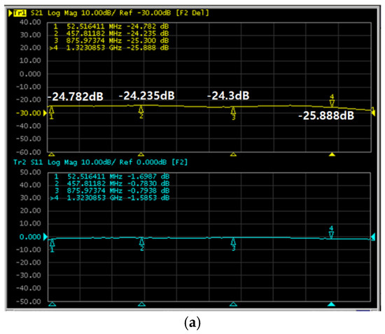 The electromagnetic shielding (SE) test method of the nickel-coated carbon fiber produced in this way was measured according to ASTM D4935 [21,22]. The electromagnetic wave shielding effect of a material is defined in Equation (2) as the ratio of the received power p1 without the shielding material to the received power p2 without the shielding material.