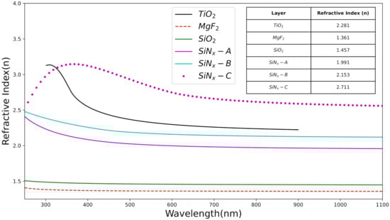 The refractive index as a function of wavelength defines the characteristics of an A R C layer [22]. Figure 2 shows the wavelength dependent refractive indices of the A R C layers such as TiO 2 [14], MgF 2 [23], SiO 2 [24], SiN x [9] thin films determined using the spectroscopic ellipsometer. The inset of Figure 2 shows the refractive index corresponding to each A R C layer. The refractive index values of the TiO 2 , MgF 2 , SiO 2 , SiN x A , B and C at 600 nm were about 2.28 2.34 , 1.36 , 1.46 , 1.99 , 2.15 , and 2.17 respectively.