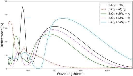 For further reduction in the reflectance, we considered the D L A R C . Figure 4 depicts the reflectance spectra of various D L A R C layers. The SiO 2 layer was capped with MgF 2 , TiO 2 and SiN x layers. The thickness of the SiO 2 layer and the capping layers were fixed as 100 nm and 80 nm respectively. The reflectance was higher for all the D L A R C layers and hence poor J s c values which are depicted in Table 2. The high reflectance values for all the D L A R C layers are attributed to the unequal optical thickness of the D L A R C layer. The necessary and sufficient refractive index condition for a D L A R C with equal optical thickness to give zero reflectance is [26]: