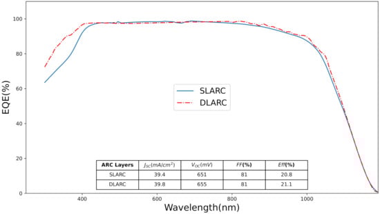 To validate the simulation data, a simulated device with identical parameters was compared to the measurements of actual solar cells in real application conditions. The industrial silicon solar cell was fabricated with both S L A R C and D L A R C . 55 nm thick SiO x layer with the refractive index of 2.05 was used as S L A R C layer. SiO 2 with 15 nm thick and SiN x with 70 nm thick were used as D L A R C layer. The monocrystalline silicon solar cell showed the conversion efficiency of 20.8 % and 21.1 % shown in the inset of Figure 7. EQE spectra indicate that the efficiency improvement for a solar cell with the D L A R C compared to the S L A R C . This improvement at the short wavelength region is vital and it’s attributed mainly to the role of the D L A R C . Thus, the SiO 2 / SiN x stacked layers reduce the reflection of high energy photons. In addition, the A R C layers provide better passivation thus enhancing the overall EQE by reducing the surface recombination at the interface. The efficiency of the solar cell using the optimized A R C layer settings is compared with the results obtained from the literature and presented in Table 4. The result indicated that the identified A R C layer configuration outperforms the previously identified S L A R C and D L A R C layers highlighted in the literature.