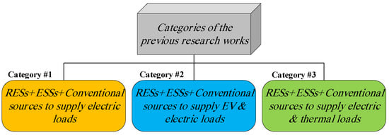 Different categories, according to the previous research works, in the field of the optimal sizing and techno-economic assessment of hybrid energy systems.
