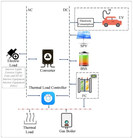 The configuration of the suggested hybrid energy system is indicated in Figure 2. Generally, there are three types of loads in the system structure. The first type is the electric load, which consists of interior lights, exterior lights, fans HVAC, and interior equipment. The electric load is connected to the AC line since the electrical equipment uses AC power. The second type of load consumption is the EV’s load consumption. The understudy house is equipped with a charging facility for the EV. Therefore, the EV is charged during particular times of the day and uses the charged power for transportation. The charging facility of the EV consumes DC power, unlike the household’s electrical equipment. The third type of load demand is thermal load. Thermal energy is generally used for heating water and the environment. As indicated in Figure 1, the PV system and gas-based FC are responsible for providing electricity to the AC/DC loads of the system. The converter also transforms DC generation to AC power. The surplus power generation is stored in the ESS and is used for periods with higher electricity demand, such as night hours when the PV system does not produce energy. Both ESS and FC are backup resources of the system, which means that they are operated when the main electricity source (PV system) is not efficient. Moreover, TLC is able to transform the surplus generation of the PV system into thermal energy. Therefore, during higher generation of the PV system, TLC can produce clean thermal energy to supply thermal demand of the system. However, the gas boiler provides power whenever the transforming power of TLC is not sufficient. The gas-based FC is also capable of providing heat power to the hybrid system, which improves the system’s performance.