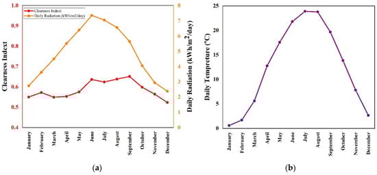 As earlier mentioned, solar irradiance and ambient temperature are the most important meteorological data that should be indicated in the paper. Figure 5 shows the solar irradiance and ambient temperature’s monthly values according to the NASA meteorological database [31]. As it is clear, the location of the study enjoys abundant solar resources during the year, which justifies the utilization of the PV system in the suggested hybrid energy system. Based on Figure 5a, during the summer months of the year, daily solar irradiation is significantly high. Moreover, during cold months of the year, a sufficient level of solar irradiation is available for providing power to loads. According to Figure 5b, the temperature is also moderate over the year, making the understudy location appropriate for the utilization of the PV system.