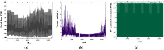 Yearly values of different types of load demand: (a) electric load; (b) thermal load; (c) EV electricity consumption.