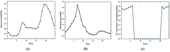 Moreover, different types of load demands are indicated in Figure 6 and Figure 7. In Figure 6, yearly values (8760 h) of electric, thermal loads, as well as EV electricity consumption are depicted [27]. As could be observed in Figure 6a, electric load consumption is raised during the summer season. However, a decline in load consumption can be seen in cold months. This pattern is typical for residential households since electric devices, such as air-cooling systems, are frequently used during the day. In contrast, thermal loads are less turned-on during the summer months, as the need for heating decreases in these months. The EV’s electricity consumption generally follows a constant pattern with minor variations during the year. Figure 7 is provided to get more information on daily variations of loads. Average values for the electric load (Figure 7a) show that there are two peaks during a day. One is at 8:00, and the other is at 19:00. However, there is only one peak for thermal load at 6:00 (Figure 7b). According to Figure 7c, the EV is charged during night hours and is driven during day hours. The PV and ESS are assumed to be main sources of charging EV [42]. More statistical details on loads, including minimum, maximum, and mean values, are provided in Table 1.