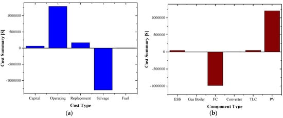 Furthermore, the renewable fraction (RF) is calculated at 66.2%. The value shows that 66.2% of the electric and EV loads are supplied with RESs. Total fuel consumption is also 1105 L/yr, which is used by the gas boiler and gas-based FC. To get more information on systems costs, Figure 8 is shown. According to this figure, salvage cost (the remaining value in an equipment of the energy system at the end of the project) is the main income of the system. Furthermore, most expenditure of the system belongs to the operating cost, which is the annualized value of all costs and revenues other than capital cost. On the other hand, the gas-based FC has the lowest cost, and the PV systems has the highest cost of the system.