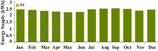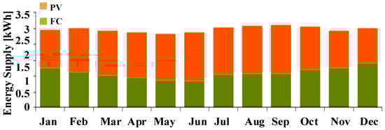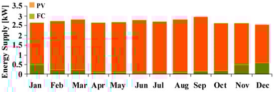 Figure 15 indicates the thermal energy provisions by boiler and FC. The boiler is the main supplier of thermal energy. Nevertheless, the FC is incorporated in supplying the loads in peak demand periods. The boiler produces more power during cold months. Due to the lack of TLC in the system’s structure, the extra generation of the PV system cannot be used for supplying clean thermal energy. Therefore, the FC produces more power to supply the demand adequately.