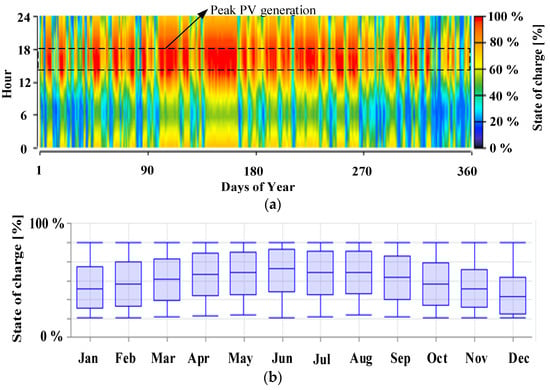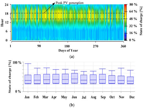 According to the results, AC electric load consists of 39.7% of the system consumption, and DC electric load (EV electricity usage) includes the rest of the system electricity consumption as 60.3%. These loads are generally provided by the PV system and FC. Around 91.8 of the loads (21,772 kWh/yr) are supplied by the PV system, and 8.16% of the load (1935 kWh/yr) is provided using FC. Figure 9 indicates the monthly energy supply of the electric loads of the system by the PV and FC. As illustrated, the PV system is the primary resource of electricity supply. However, during cold months, when the solar potential is lower than the other months, the FC provides the required electric power. It is important to mention that the value of unmet electric demand is achieved at zero, which shows the sufficiency of the available sources. Figure 10 shows the operation of the ESS during the year. It is clear that the ESS plays an important part in the power supplying of electric loads. In general, the ESS is mainly charged during the daylight and is discharged during night hours to supply both EV electricity consumption and electric loads of the consumer. The ESS’s state of charge is relatively low in cold months. This is due to the lower production of the PV system and results in frequent utilization of the ESS during power deficiencies. Additionally, most of the ESS’s charging is conducted during the PV system’s peak generation, as illustrated in Figure 10a.