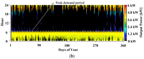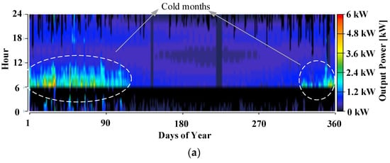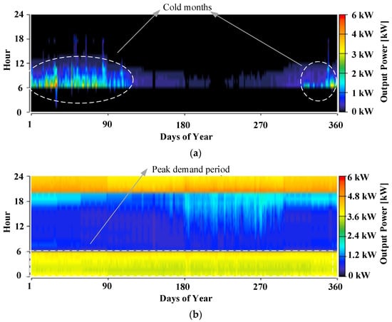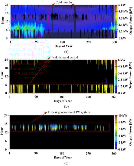 The thermal demand of the system is largely provided by the gas boiler 68.6% (5861 kWh/yr), TLC 16.8% (1431 kWh/yr), and FC 14.6% (1247 kWh/yr). This shows the significance of TLC in the thermal power provision, which has a higher ratio of supply than the FC. Figure 11 shows the output power of thermal power suppliers, namely, gas boiler, FC, and TLC. As indicated in Figure 11a, the gas boiler provides greater amounts of thermal power to the loads in cold months. This is because the thermal load consumption is higher in cold months (Figure 6a). In addition, the boiler is operated in most hours of a day, but larger amounts of power are produced during peak periods. As shown in Figure 11b, the FC is usually operated during night hours and mainly in peak demands. This is more visible in cold months of the year. On the other hand, the TLC mostly provides thermal mostly in the peak generation of the PV system. Therefore, excess electricity by solar energy is used for supplying the thermal demand of the system. According to the results, the boiler is operated 7956 h/yr, the FC is operated 529 h/yr, and the TLC is operated 419 h/yr.