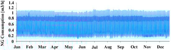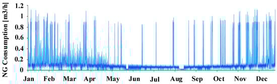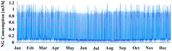 Other important results of the study are related to the environmental performance of the hybrid energy system. The fuel consumption graph is depicted in Figure 12. As can be seen, fuel consumption is greater from November to December (cold months of the year). Total NG consumed is 1105 m3 with an average per day consumption of 3.03 m3/day. The NG consumption of the boiler and FC are 698 m3/yr and 406 m3/yr. Consuming fossil fuels such as NG will lead to the production of greenhouse gas emissions such as CO2 and CO. In this study, the proposed hybrid energy system emitted 2144 kg/yr of CO2 and 0.0813 kg/yr of CO.
