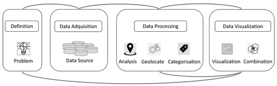 Figure 1 shows the main stages of the methodology of COVIDSensing. The first stage consists in defining the problem to be addressed. Then, the data-acquisition stage crawls information from different data sources, mainly from social networks and official sources. In the next stage, data are processed in several steps. On the one hand, data are geolocated. On the other hand, the NLP module analyses and categorises the micro-texts obtained from social networks. Moreover, the ML module analyses the official data about the COVID-19 pandemic to predict the evolution of different variables, such as the number of active cases or deaths. Finally, the outcomes are visualised, and conclusions can be drawn from them, for which we can even combine different problems by either joining or intersecting the data.