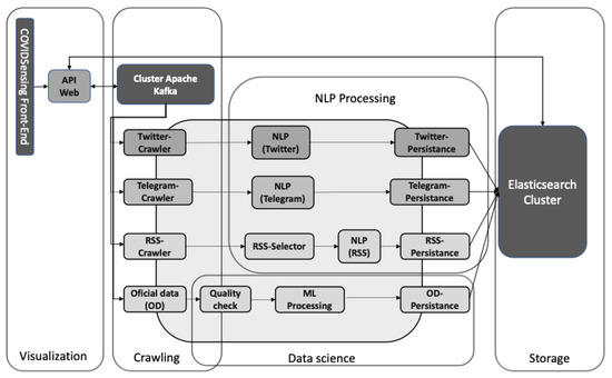 Figure 2 shows the internal implementation details of COVIDSensing. The execution flow starts on the left-hand side of this figure, at the front end of the application. Based on Google’s Firebase, it communicates with the web API, where different micro-services are available. The Apache Kafka cluster, which is a distributed streaming platform not only to publish and subscribe to streams of records but also to store and process these streams in real time, distributes the information received from social-media sources. In this regard, there are three main streams of records in our application: the first two are generated by the Twitter and Telegram crawlers, and the latter by the RSS crawler. The data derived from these crawlers are sent to the NLP module that is explained below. Finally, the information is persisted in an Elastic Search database.