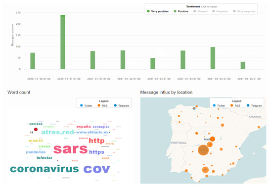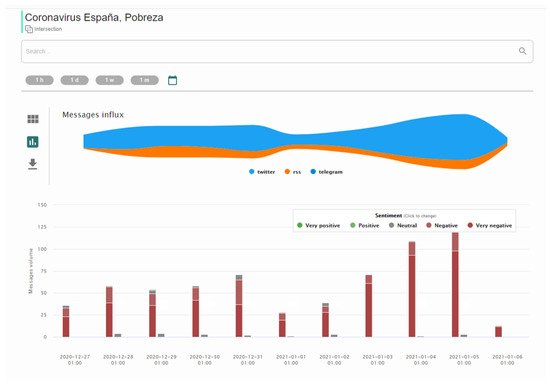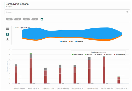 At the visualisation stage, the tool offers trend graphs that can be customised by date or by the default options of month, week, day or hour. Current active data come from Twitter, Telegram, and RSS. Figure 3 shows an example of a search on the problem of “Coronavirus in Spain” between the dates from 30 December 2020 and 6 January 2021. As can be seen, most of the messages came from the social network, while no information was obtained from Telegram.