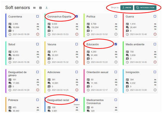 In the example shown in Figure 5, we wanted to make an intersection between coronavirus in Spain, racial inequality, and education. In this regard, when users want to perform both the intersection and the merging of topics, the tool moves back from the visualisation stage to the data-processing stage to obtain the results from which we can derive useful information.