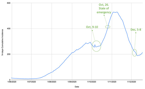 Comparing Figure 6 and Figure 7 with respect to the evolution of the pandemic, the cases of COVID-19 in Spain were decreasing at the beginning of October. This scenario changed suddenly from 12 October onwards, when again the number of people infected started to increase, even at a higher rate from October 16. Several days after the declaration of the state of emergency (5 November), Spain drastically reduced the 14-day cumulative incidence.