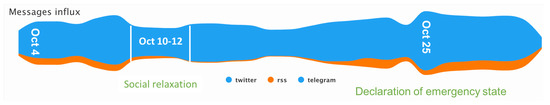 Figure 7 reflects an example of this situation, showing the number of positive messages on social media (i.e., Twitter, Telegram, and RSS) during October in the semantic space "Coronavirus in Spain". This semantic space is composed of the following words: coronavirus, covid-19, sars, pandemia [pandemic], sars-cov-2, epidemia [epidemic], contagio [contagion], infección [infection], cuarentena [quarentine], and incubación [incubation]. Indeed, these are the main keywords typed by users when posting messages about the COVID-19 pandemic. The number of posts about this semantic space decreased significantly only during the vacation period in October (10–12 October). After that period, a lower number of posts compared to the days before holidays was reported. Therefore, social interactions usually increase during holiday periods, reducing the number of social network messages about the coronavirus; when people have fun, they forget about the pandemic. Moreover, security measures against the coronavirus are relaxed (e.g., the use of masks, social distancing, etc.), which means that there is a post-vacation period where these measures continue to be relaxed. The announcement of the state of emergency on October 25 increased once again the number of messages about Coronavirus on social networks.