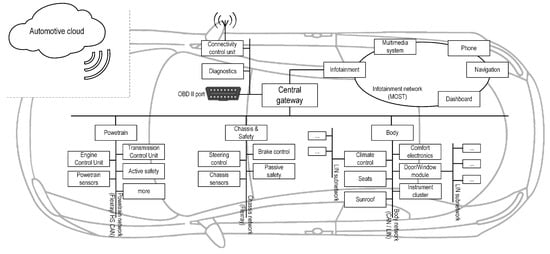 Technological advancements have entirely reshaped the automotive industry. Modern auto-vehicles are built upon a vast collection of sensors that provide a large amount of data processed by dozens of Electronic Control Units (ECUs) [1]. ECUs monitor and control advanced technological systems providing an extensive palette of features to the vehicle’s end-users (e.g., automated parking, driverless vehicles). An overview of the vehicle’s internal architecture is shown in Figure 1.