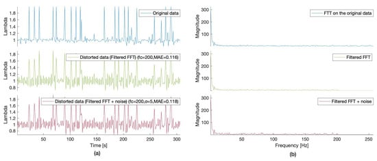 1D FFT-based data distortion for the Lambda sensor data (-cut-off frequency, -discord, -Mean Absolute Error): original data values (blue), filtered values in frequency domain (green), filtered and perturbed values in the frequency domain using additive Gaussian noise (red). (a) Time domain. (b) Frequency domain.
