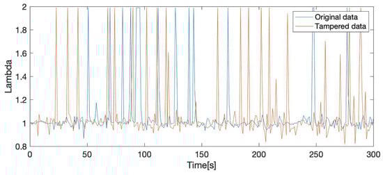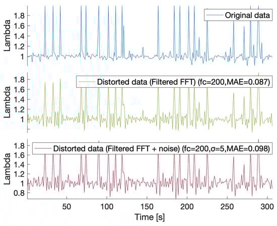 Figure 2 shows the raw measurements (lambda) collected from the lambda sensor over a time interval of 400s and the distorted signal resulting by applying the perturbation procedure described in the previous section (Algorithm 1). Two sets of parameters ( and ) have been utilized, as indicated in the figures.