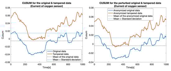 CUSUM for the original data (blue) and tampered data (orange) for the Current of oxygen sensor.