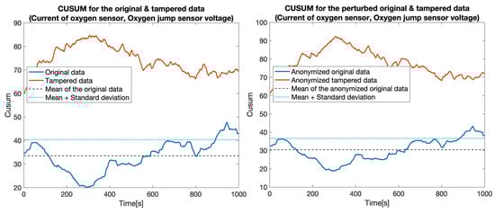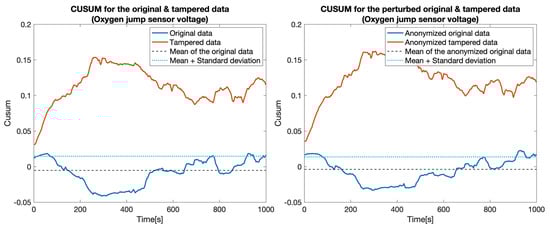 CUSUM for the original data (blue) and tampered data (orange) for the Oxygen jump sensor voltage sensor.