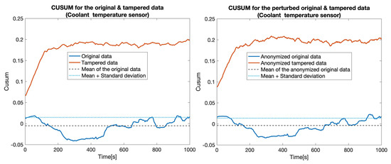 CUSUM for the original data (blue) and tampered data (orange) for the Coolant temperature sensor.
