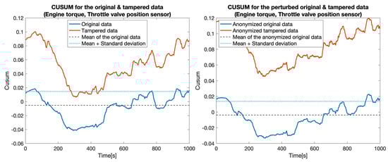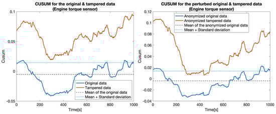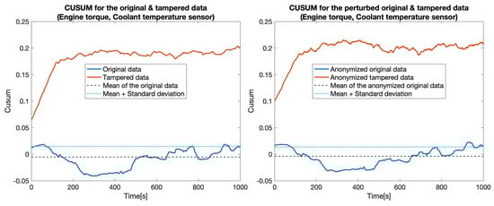 CUSUM for the original data (blue) and tampered data (orange) for the Engine torque sensor.