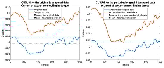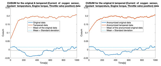 CUSUM for the original data (blue) and tampered data (orange) for sensors: Current of oxygen sensor and Engine torque.