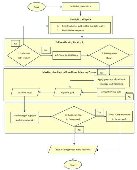 Further, in this study, we describe the different major design limitations. Communication is one of the crucial parameters in the design of multiple unmanned aerial vehicles. Another crucial parameter is limited battery energy [,]. Several other major challenges are flight trajectory selection, energy limitations, adaptive routing protocols, power constraints, etc. that require consideration in this network. The main challenge is high mobility in the FANETs. Another challenge is an irregular change in the structure of the nodes in the specified network. Many researchers have introduced many techniques and algorithms to overcome these challenges in the network [,,,,,,,]. In this research work, we discuss the solution to overcome these problems, while minimum routing overhead, low computational complexity, and maximum throughput parameters can be used efficiently for load balancing in the network.