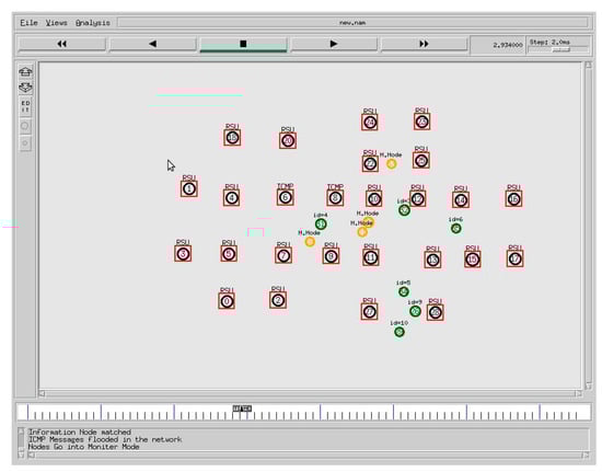 The simulation study primarily generated different nodes in the network zone, where the beginning time of source nodes was consistently distributed over the first 60 s of the simulation time. We arbitrarily place some flying nodes in the network area. The defined area has different types of flying nodes: non-malicious flying nodes and malicious flying nodes. Non-malicious nodes are the normal nodes, which follow the rules from the source point to the destination point. On the other side, malicious nodes are the compromised modes, which do not follow the rules from the source point to the destination point. These nodes may modify or drop some packets. In the network, some nodes act as central controller units and others as UAV nodes. The characteristics of UAVs are mentioned in Table 4: