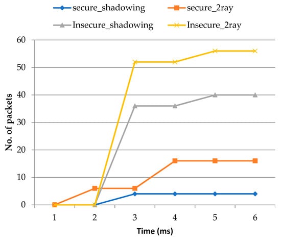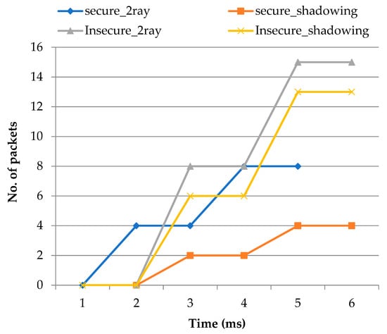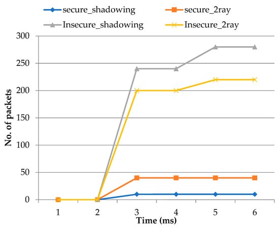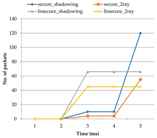 Figure 6 displays the packet loss of flying nodes, where the X-axis represents the maximum speed of flying nodes in the network and the Y-axis represents the packet loss ratio in the network. A comparison is made between secure and insecure two_ray and shadow models in the network. The packet wise description for the packet loss parameter in flying nodes is discussed in Table 5.