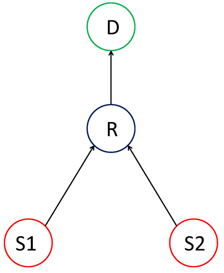 The Y-network consists of two source nodes and , the destination node D, and the intermediate sender–receiver pair that acts as relay R to facilitate the communication between the sources and the destination, as shown in Figure 1. However, it is essential to realize that there is no direct link between the two sources. In addition, the three communication links are assumed to have orthogonal resources such as frequency or timeslot. As a result, there will be no collisions on such a network. Moreover, these three links are modeled as binary erasure channels (BECs) with different erasure probabilities.