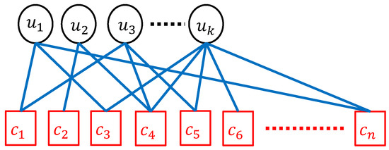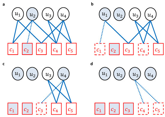 Figure 3 illustrates a toy example of the BP decoding process. In the example, there are four source symbols and six encoded symbols. In the beginning, the decoder finds the degree-one encoded symbols , and then its source symbol neighbor is recovered immediately (i.e., ), as shown in Figure 3a. Then, all the encoded symbol neighbors of the recovered source symbol will be updated: and . Then, their connected edges to the recovered source symbols will be removed, as shown in Figure 3b. Repeatedly, the decoder searches for a degree-one encoded symbol, which is in this case. Now, the encoded symbol is recovered, . Then, the encoded symbol is updated , and its connected edge to is removed. Consequently, is recovered , as depicted in Figure 3c. Likewise, encoded symbols and , which are neighbors of , are updated; and , and their connected edges to , are removed. Finally, the source symbol is recovered; , as shown in Figure 3d.