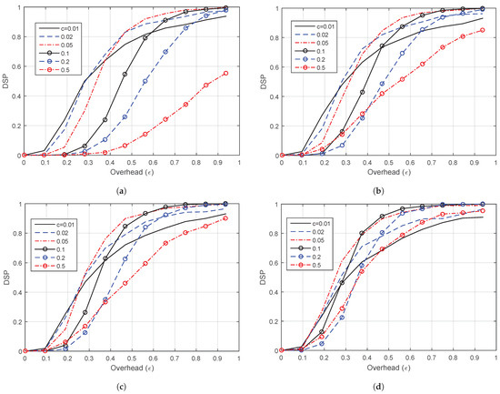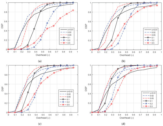DSP versus the overhead () for LT codes of at different values of c. (a) . (b) . (c) . (d) .