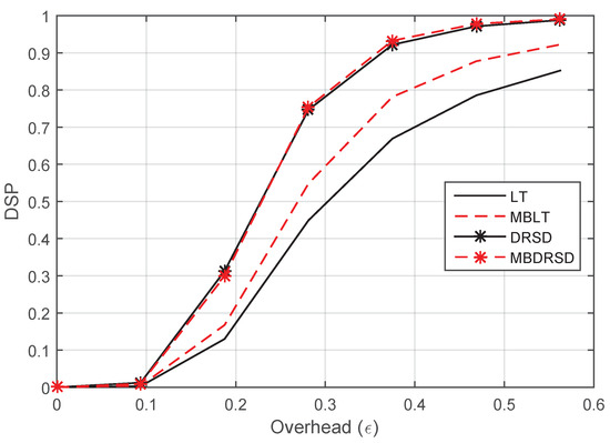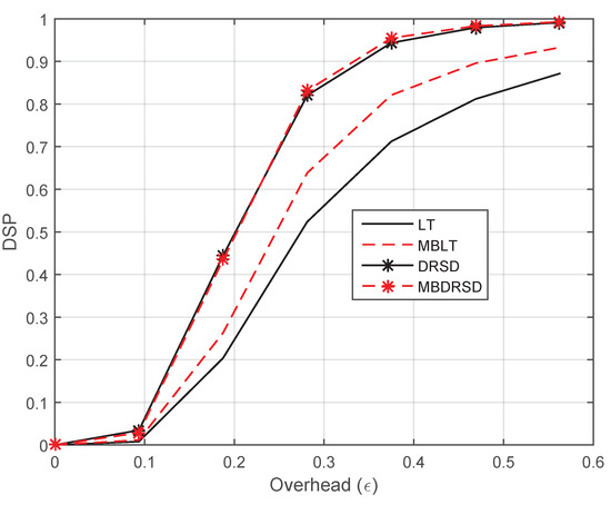 In order to show that the same enhancements are applicable in different environments, the DSP and BER for the same schemes with different channel environments are shown in Figure 8 and Figure 9, respectively. The new channel erasure rates are , , and . These two figures show that using the proposed scheme enhances the performance once it applies to the regular LT codes or DRSD. While the DSP and BER are improved, the decoding time is insignificantly increased. For example, with an overhead of , the regular LT code requires 1.6 ms, and it achieves BER = 0.1553, whereas the MBLT code requires 1.7 ms, and it achieves BER = 0.07836. Likewise, DRSD and MBDRSD require 1.73 ms and 1.87 ms, respectively, and they achieve a BER of 0.0105 and , respectively.