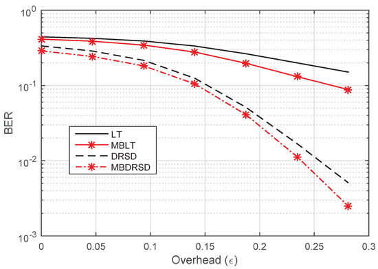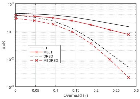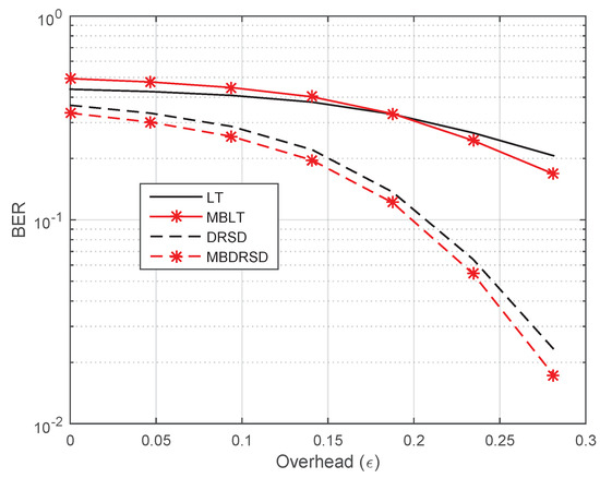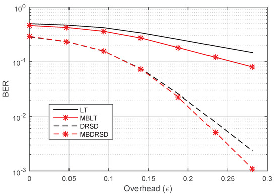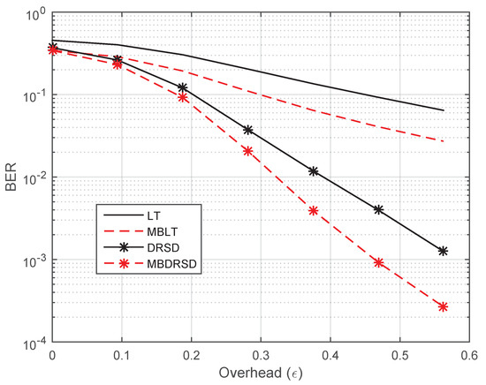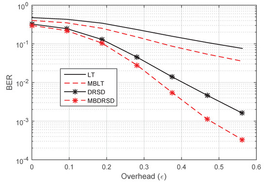 In a similar manner, Figure 7 shows the error probability (i.e., BER) versus the code overhead () for the four schemes shown in Figure 6 with the same parameters. As has been noted from Figure 6 and Figure 7, the proposed scheme outperforms the conventional LT code and DRSD codes in terms of DSP and BER. However, this improvement comes with costs; the decoding running time is slightly increased. For instance, at the overhead of , the LT decoder requires, on average, 2.07 ms to complete the decoding process with a BER of 0.1227, but the MBLT requires 2.27 ms with a BER of 0.0587. Similarly, DRSD requires 2.29 ms with a BER of , while MBDRSD requires 2.49 ms with a BER of .