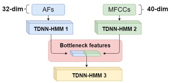 Figure 4. Architecture of the proposed parallel-mode ASR. Outputs (bottleneck features) of both single-stream hybrid systems are concatenated. The new concatenated set of features is set as input for the multi-stream hybrid system i.e., TDNN-HMM 3. - Joint-mode: the joint-mode approach is described in Figure 5. The joint-mode involves two separate layers for two individual feature streams, and one combination layer to integrate the medium representation of the individual stream. The configuration of the joint-mode is shown in Table 2.