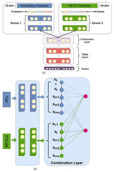 Figure 5. Architecture of the proposed joint-mode multi-stream ASR. Two feature streams are input to the TDNN system and a combination layer is used to combine two feature streams followed by a 3-layers TDNN. (a) shows the overview of the joint-mode multi-stream framework while (b) is the details of the combination layer.