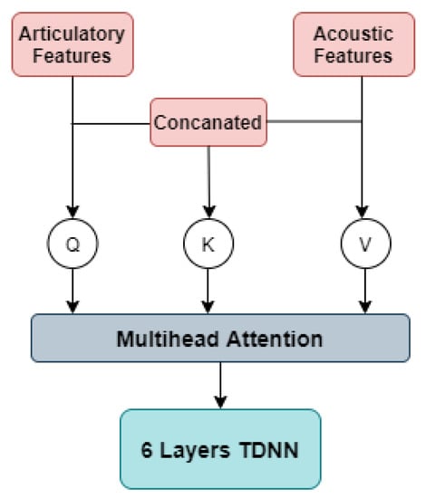 Figure 6. Architecture of the proposed mha-mode ASR.In our experiments, the Q is represented using MFCCs, the K is represented using AFs and the concatenated features are used as V. After fusing those features, a 6-layers TDNN-HMM model is used to train the ASR.
