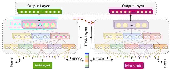 Figure 7. Cross-lingual adaptation from multilingual to Mandarin. The chain TDNN system is trained with concatenated AFs and MFCCs for multilingual speech recognition. The network learns similar acoustic representation (both languages, Mandarin and English) by transferring knowledge on the TDNN layer’s weights. The Mandarin system (also chain TDNN) is initialized with the same multilingual system’s weights (pointed by the red arrow). The input and output layers are different between both languages. - Feature concatenated approach: The MFCCs and AFs are concatenated into one feature vector directly. Then the concatenated features are used to train the TDNN-HMM ASR model.