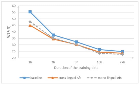As expected, the more training data employed during training, the better performance the system yielded. In the case of low-resources (i.e., very limited data, less than 5 h) the cross-lingual AFs outperform the system trained with monolingual AFs. More specifically, in the condition of extremely low-resourced training data (i.e., 1 h train subset), the cross-lingual AFs (45.0% WER) have a significant improvement compared to MFCCs baseline (55.4% WER) and monolingual AFs (47.8% WER). Therefore, the less training data, the better improvement can be reached using cross-lingual AFs.